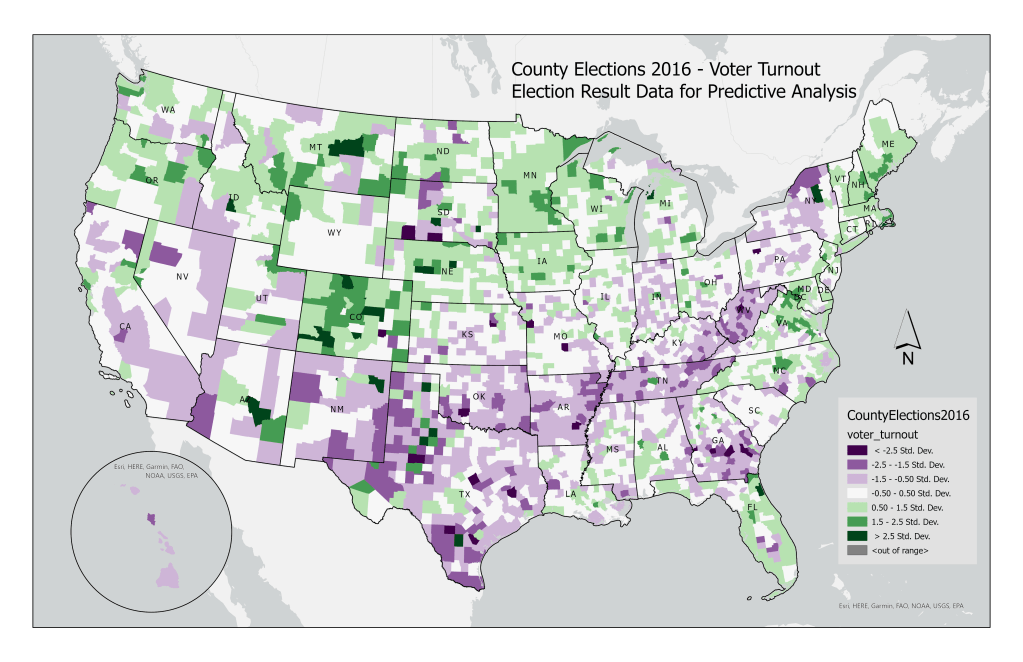 The Standard Deviation method was used to classify voter_turnout, as it is normally distributed; below-average voter turnout counties are represented in shades of purple, and above-average in shades of green.