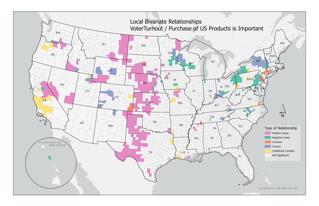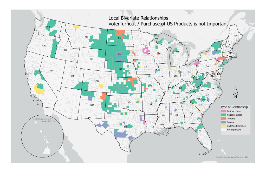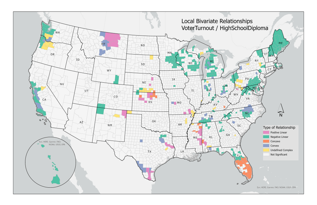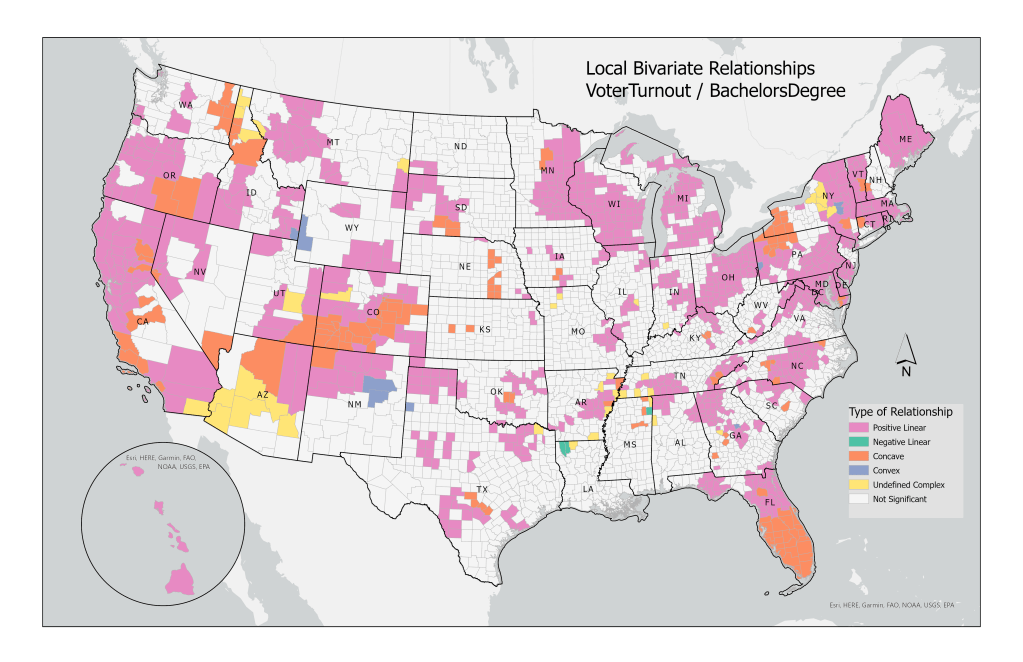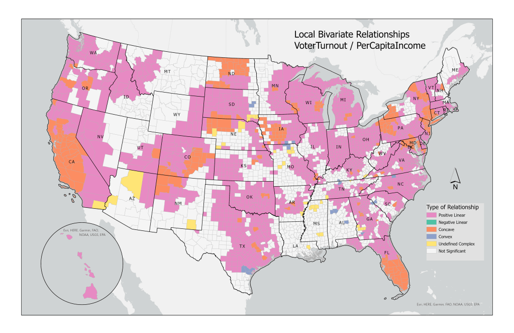 Hawaii (farthest bar to the right), West Virginia, and Tennessee have the lowest average voter turnout. The Local Bivariate Relationships tool identifies linear, concave/convex, as well as other complex relationships; colors correspond to the type of relationship found in that area.